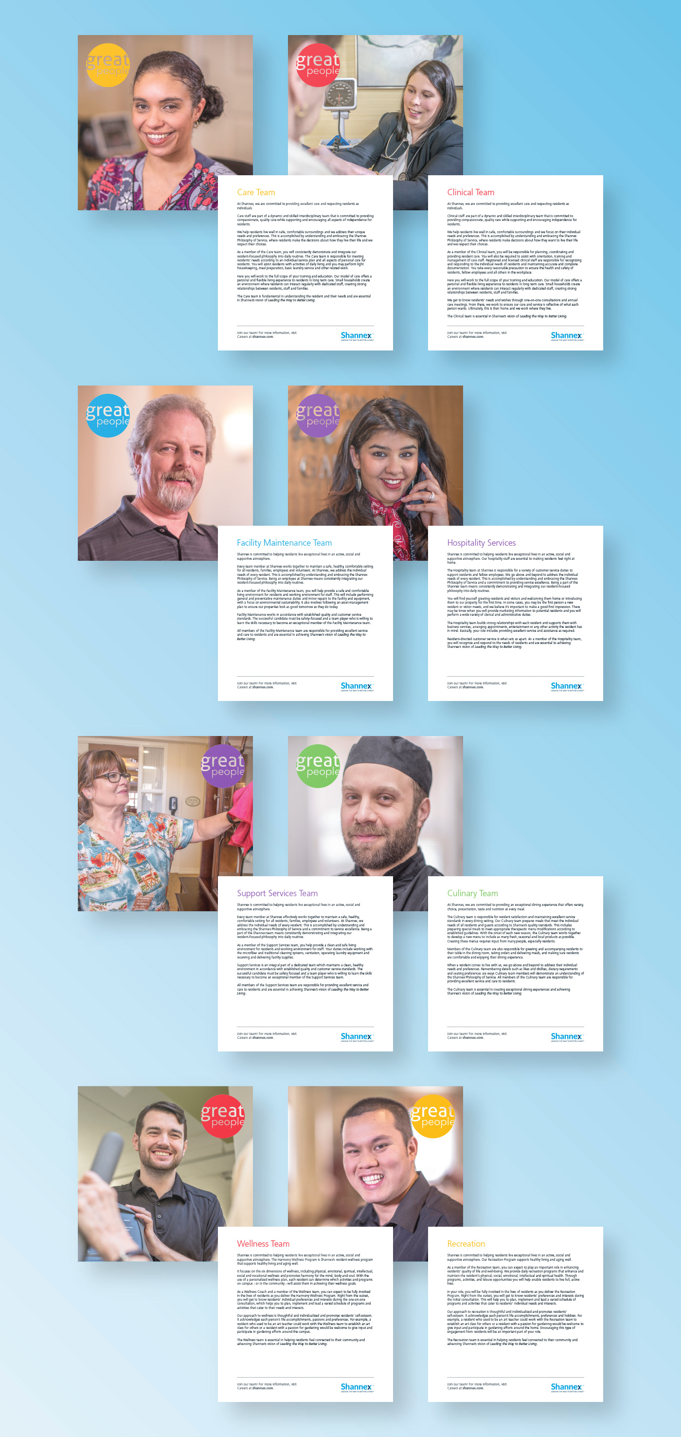 Employment cards created for Human Resources. To reduce waste, each available department has their own card that can be collected by interested people at job fairs.
